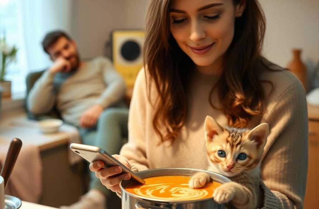 A telefon? Znowu leży na parapecie. Już niepotrzebny. Bo prawdziwe słowa nie są w powiadomieniach. Są w dotyku. W spojrzeniu. W rudym kłębku, który przyciska się do nóg. I zostaje. Bo jesteś mu potrzebna.